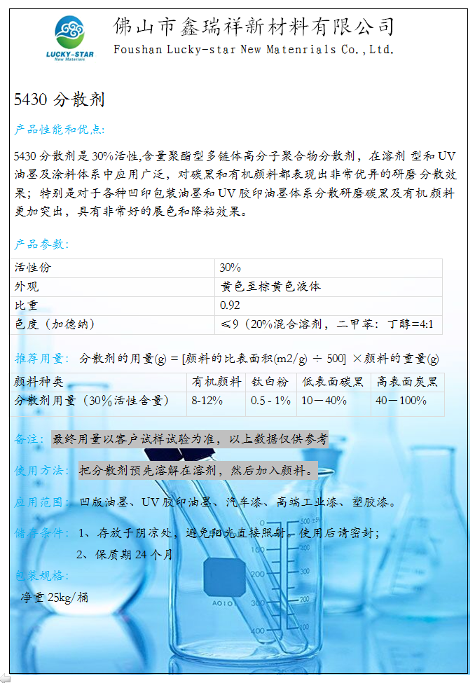 简介—— 5430分散剂产品性能和优点:5430分散剂是30%活性,含量聚酯型多链体高分子聚合物分散剂,在溶剂 型和UV油墨及涂料体系中应用广泛,对碳黑和有机颜料都表现出非常优异的研磨 分散效果;特别是对于各种凹印包装油墨和UV胶印油墨体系分散研磨碳黑及有机…